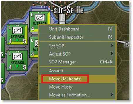 You can alter the order for each movement point. You can go from a Hasty move to a Deliberate Move and finish with an Assault move if it fits the need. You can also adjust the unit’s SOP setting for each order in the list in this dialog and there are cases where that will be useful.
