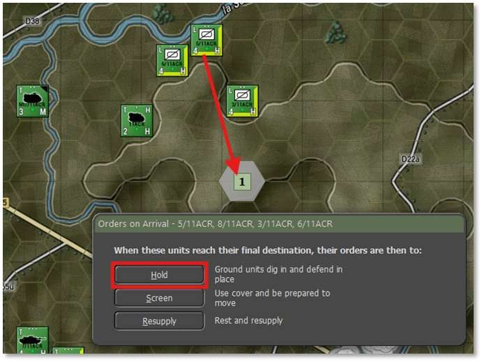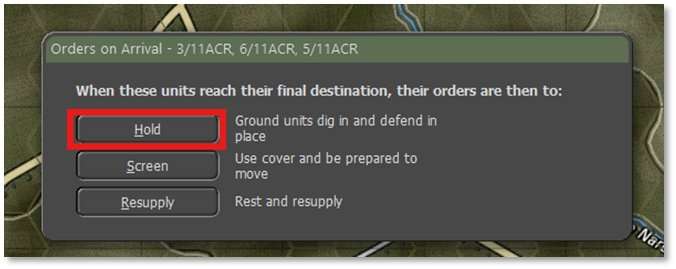 Then from the Orders on Arrival dialog, click on Hold to have the units dig-in and defend from the final locations.