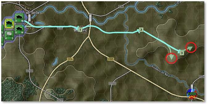 Next, select the following waypoints to move these units behind the ridge just south of Marsel. Then select the Mortar and position final waypoint out as seen below. Set the Order on Arrival to Hold for these units.