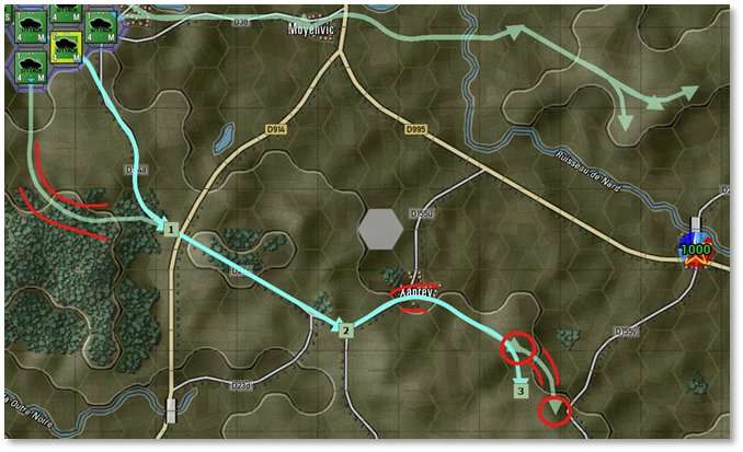 A standard movement order makes all the selected units travel and ends on the given waypoints. To not stack up and be a larger target for the enemy, especially artillery, we need to select each of the three Scouts and click on two of the end points and drag them to either side of the final waypoint with the end result as seen below. To help see all movement paths, select the Multi-Unit Overlay from the Main Menu, and click on All Paths or click on the Paths button in the bottom left bar.