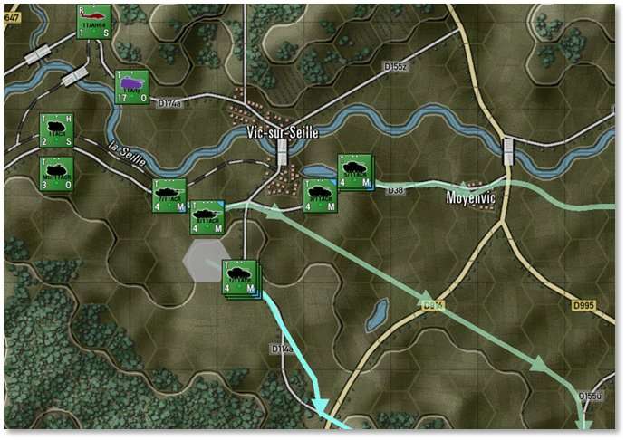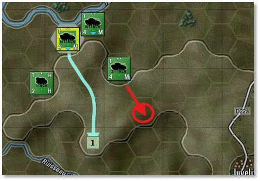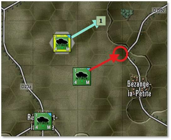 Once the movement order is issued, the troops mount up, and the counter image changes from the NATO Scouts to the M3 Bradley and the movement type goes from L (Leg) to T (Tracked) as seen below.