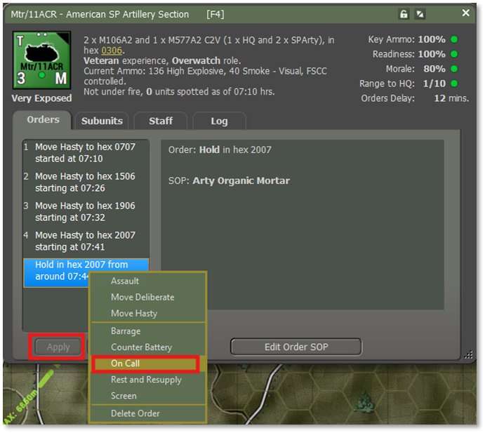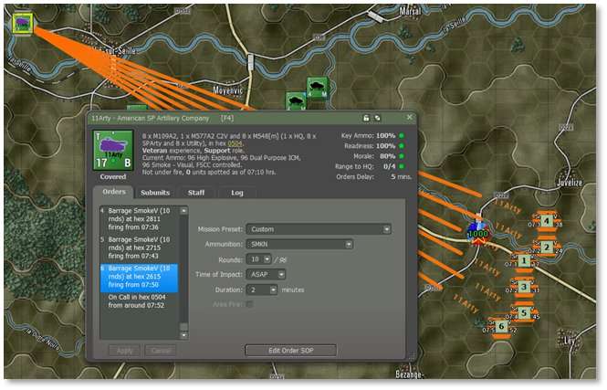 Hit the Commit button to lock in the barrages and this will pop up the Dashboard for the Artillery unit and show the fire missions on the map as seen below.