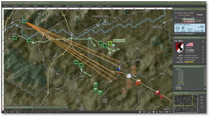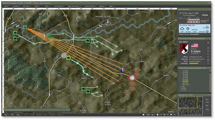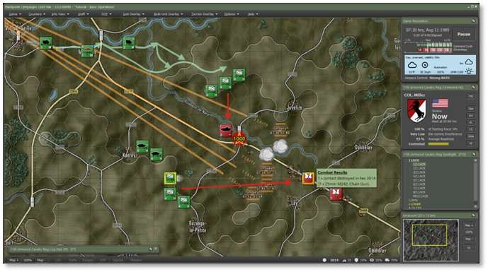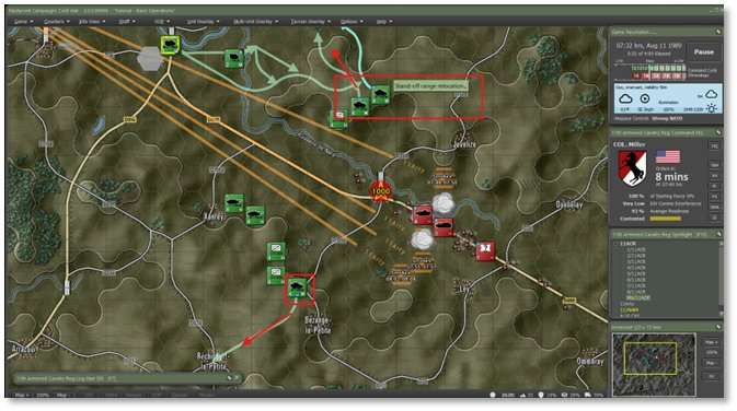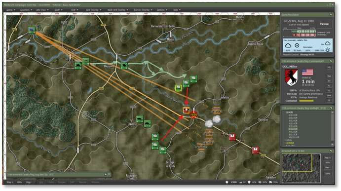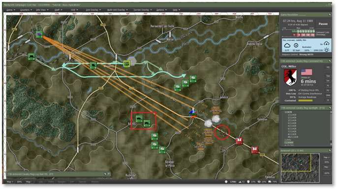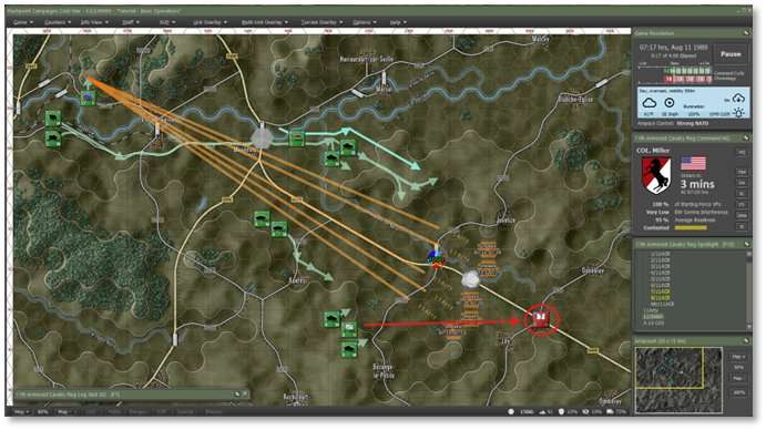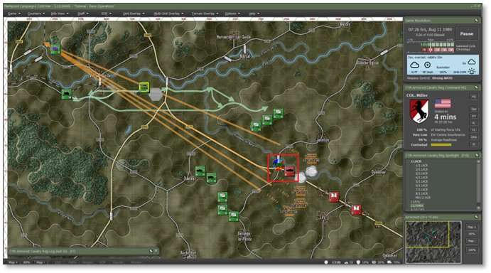 While the Scouts and Tanks have another turn or two on the move to reach the fire positions, we need to order the AH-64 Attack helicopter to begin moving out. It is much faster than the ground units, but units will now have some orders delay getting going as we are now past the pre-battle orders.