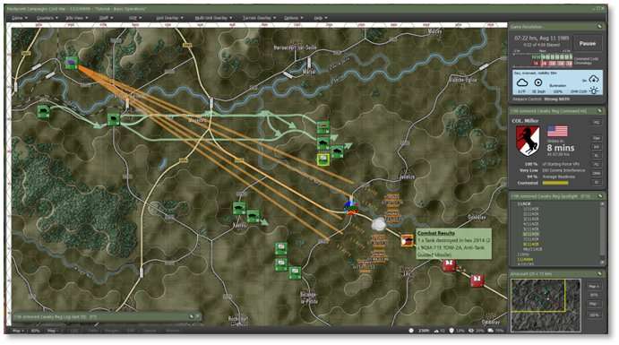 1 minute later, the contact is identified as T-80s and a TOW-2A finds its mark. Also of note, the AH-64 has fired off its ATGMs and is pulling back to the HQ to rearm.