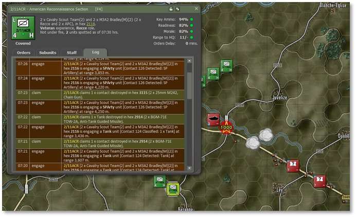 After the turn ends, opening the Dashboard of the AH-64 and checking the Log tab, we see the reports of the engagements and the claimed kills.