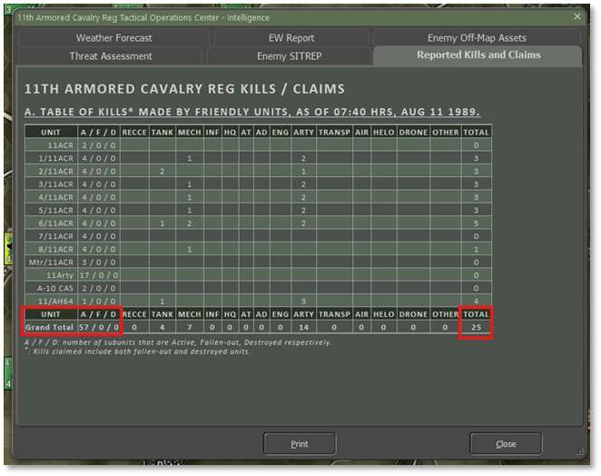 Now open the Intelligence Staff report dialog by hitting the “Int” button on the Command Panel. Select the Reported Kills and Claims tab. Here you can see what your units have claimed were destroyed up to this point in the battle.
