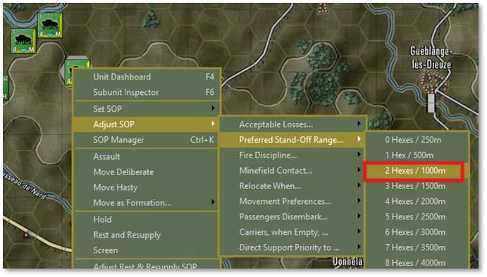 Shift-Select all six scout units and then right-click on one to bring up the orders menus. Select Adjust SOP/Preferred Standoff Range and click on 2 Hexes / 1000m to set the new range.