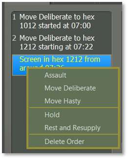 - This window lists the unit’s orders noting the type of order, the hex location of the order (four-digit column/row grid coordinates), and the estimated start time of the order execution. Left-click to select any of the orders to view their SOP information. Right-click to open a popup menu to change the selected order. The selection is context-sensitive based on the initial order, as seen below.