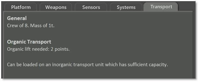 The Transport tab shows all transport capabilities of a platform. It first lists general information including the crew size and mass, followed by Organic Transport capacity. For the tracked armored personnel carrier pictured below, the Carrying Capacity is noted: