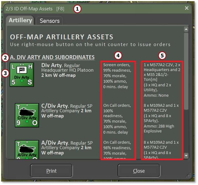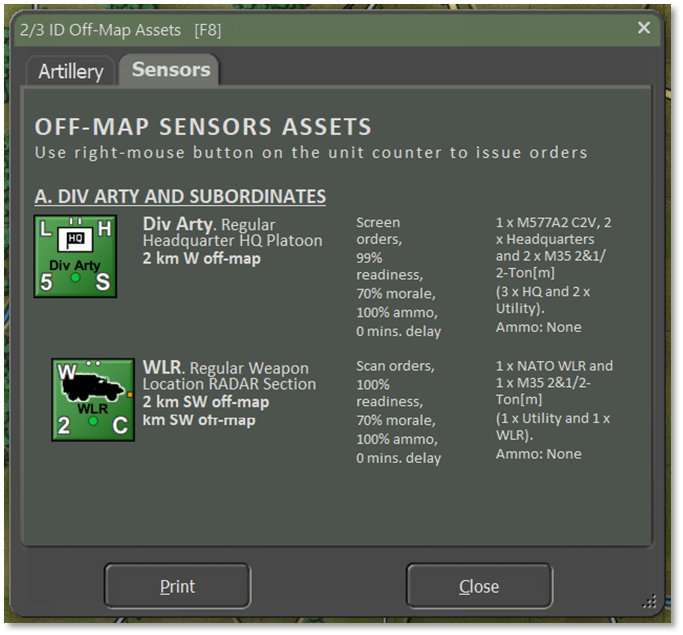 The Off-Map Assets dialog [F8] provides a listing of any forces that exist off-map that can support your on-map force. This includes aircraft or artillery assets in the Artillery tab and weapon locating systems in the Sensors tab. For example, in the image below a headquarters and an artillery battery are located 2 km off the west edge of the game map.