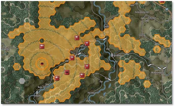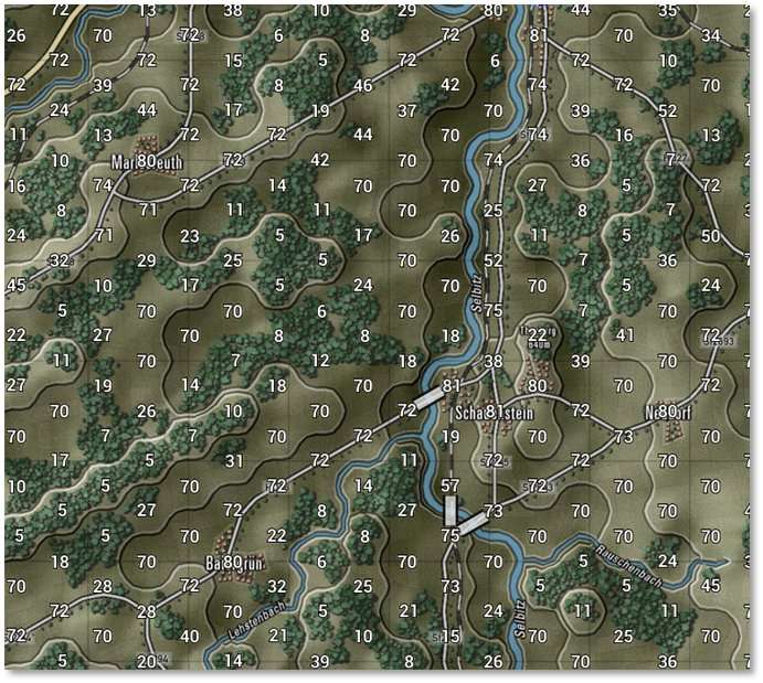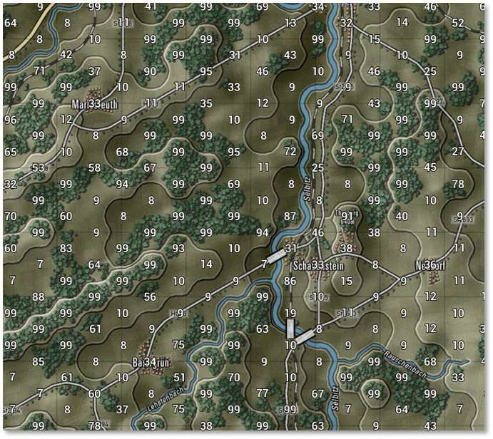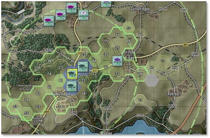 The numbers in the hexes represent the visual capabilities of that hex. Higher numbers mean a better chance to Spot enemy units from those hexes. Hexes inside the hard outline are within weapons range. See Section 24 below for more details on LOS and the Spotting of units.