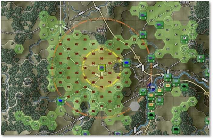 Each hex also shows the visual capability values. Higher numbers mean a better chance to Spot enemy units that may be in that hexes. Hexes inside the hard outline are within weapons range. See Section 24 below for more details on LOS and the Spotting of units.
