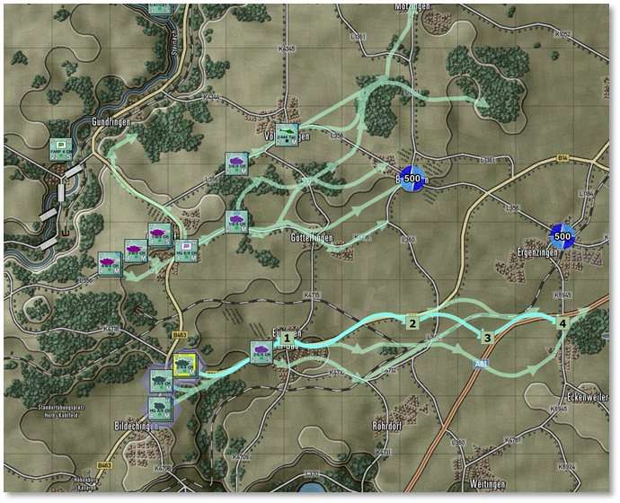 Primary orders for each unit can be glimpsed by checking the Movement markers present along the edges of the counters (see Section 17.1 below). For example, a blue triangle along one edge or in a corner indicates the direction a unit will advance with Deliberate Movement.