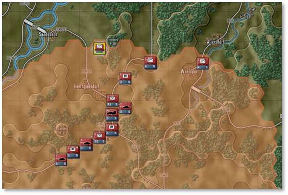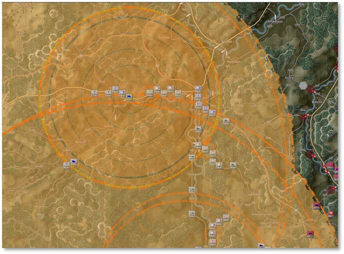 The above image also shows a darker line connecting the selected HQ to the higher-level HQ while lighter lines extend from the selected HQ to its lower-level subordinate units. The HQ command ranges are drawn as circles which are also shaded by superiority (darker = higher up).