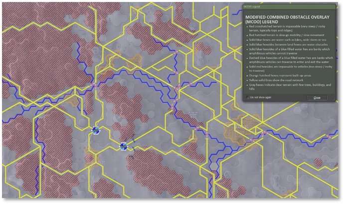 Selecting this option brings up the MCOO. The overlay shows various colors, hatching, and edges that represent various levels of useful terrain information. A legend pops up to explain the colors and patterns as well as the implications of the various information shown. Use this information to quickly note poor mobility areas, clear lanes of fire, impassible terrain, and good locations to hide recon units. Legend details are also provided in Section 16.12 below.