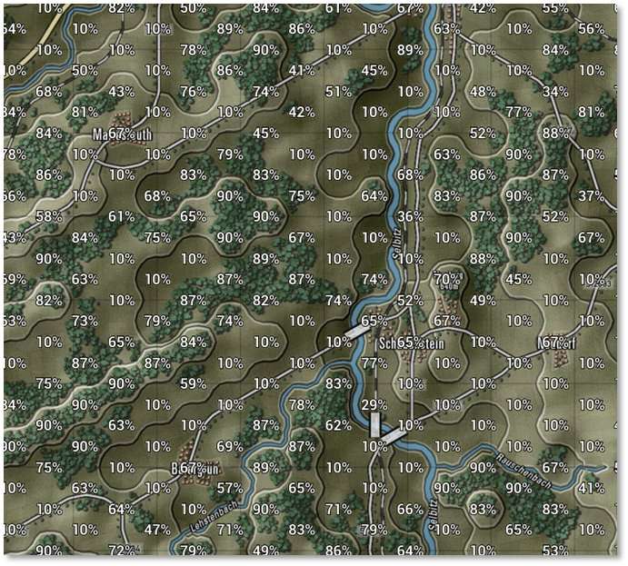 Selecting this option shows the Concealment rating for each hex on the map in white numbers. Concealment ratings range from 1 to 99 percent and represent the terrain’s obstruction of units’ Spotting and Line of Sight abilities, with 1 being no blockage and 99 being extreme degradation.