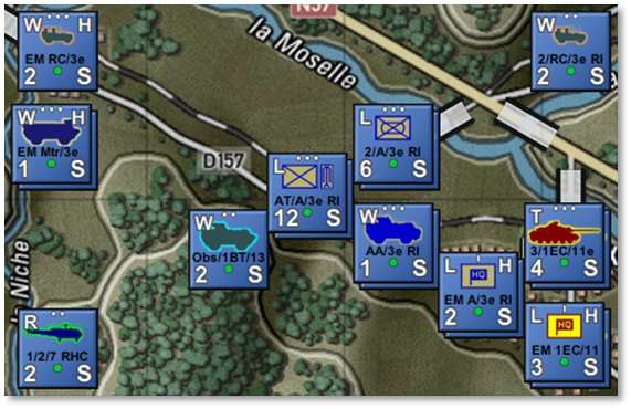Show Large Simple Unit Counters [Ctrl+J] – Displays large NATO symbols on all the counters to make the unit type more visible at extreme zoomed-out map levels. These symbols remove some other counter information in order to be larger as demonstrated below. Default silhouette counters are on the left and Large Simple Unit Counters are on the right.