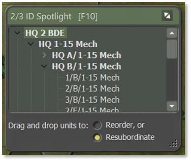 Dragging a unit name puts it under the command of whichever unit the mouse is hovering over when released. This allows resubordination to any unit, not just HQs, which can be helpful in some circumstances. Ensure you are releasing the selected unit over top of the HQ’s name to have it resubordinate to that HQ’s command. This will look like the selected unit being in line with the same level of nesting as the rest of that HQ’s subordinates, rather than pushed one more level in under one of the other subordinates.