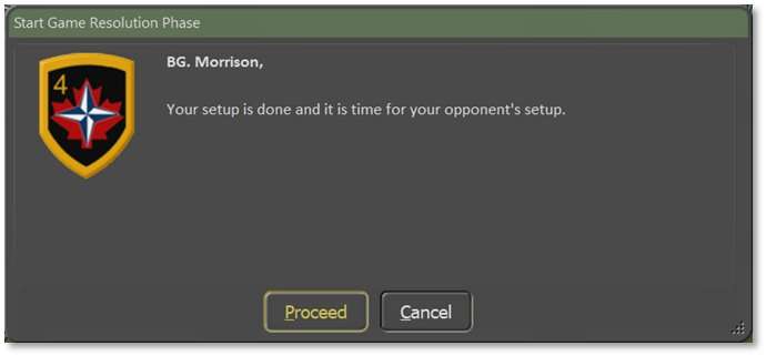 The scenario will load, and then you are ready to set up your turn. Issue initial orders for your forces and click Start in the Game Control Panel (refer to Section 13.1 below). You will then get the following dialog alerting you that your opponent needs to do their initial orders. Click Proceed to get a new dialog to enter information for the PBEM Classic file.