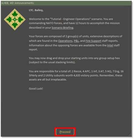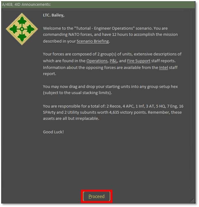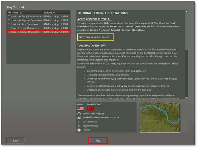 As shown in the screen below, a list of tutorials will appear. Select Tutorial - Engineer Operations, review the scenario briefing information, then click the “Play” button at the bottom of the dialog.