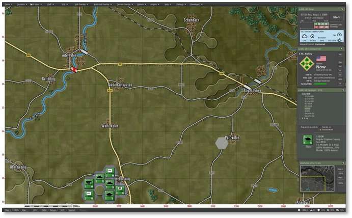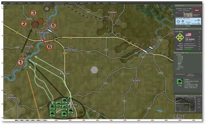 When ready, click the “Start” button in the upper right corner to initiate the battle. The game will resolve the next 15 minutes of game time, advancing to the next Orders Phase. If the operation proceeds as planned, the engineer units will move toward the river during this initial phase.