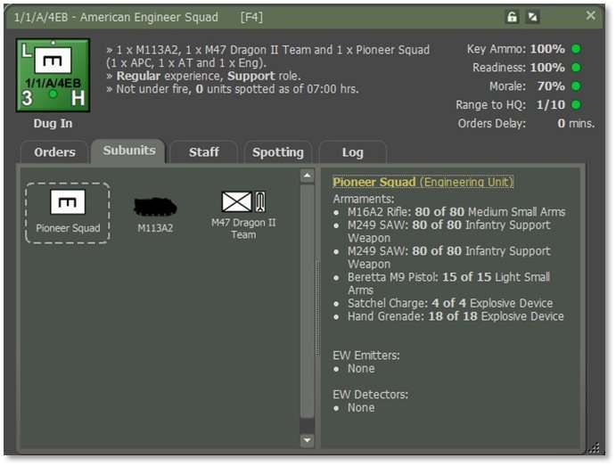 Role: The Combat Engineer Platoon is responsible for breaching obstacles, clearing minefields, and providing mobility support for maneuver forces. The M113A1 APCs provide armored transport and protection for 1x engineer squads during operations.