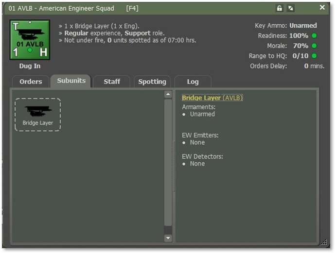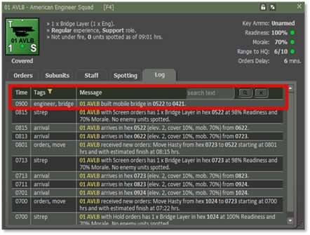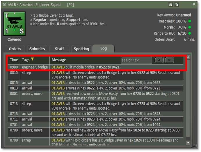 Press Start at this time to commence the next turn resolution and the 01 AVLB will begin the process of laying the bridge. It may take several turns to complete the bridge. Once the bridge building is complete, the Engineer Report will now show that the 01 AVLB bridge is deployed. You can also go to the unit dashboard to see the Log for that bridge layer. As shown in the Dashboard/Log below.