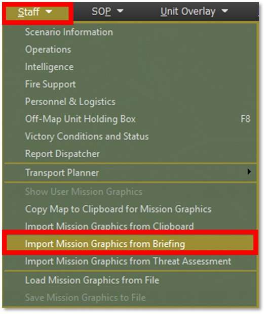 The first step is to review the Mission Overlay to understand the battlefield layout better. Select " Staff " from the Menu, then choose "Import Mission Graphics from Briefing" to display the operational graphics on the map.