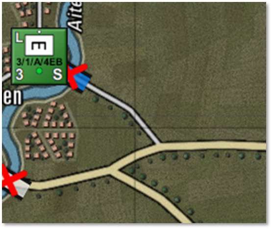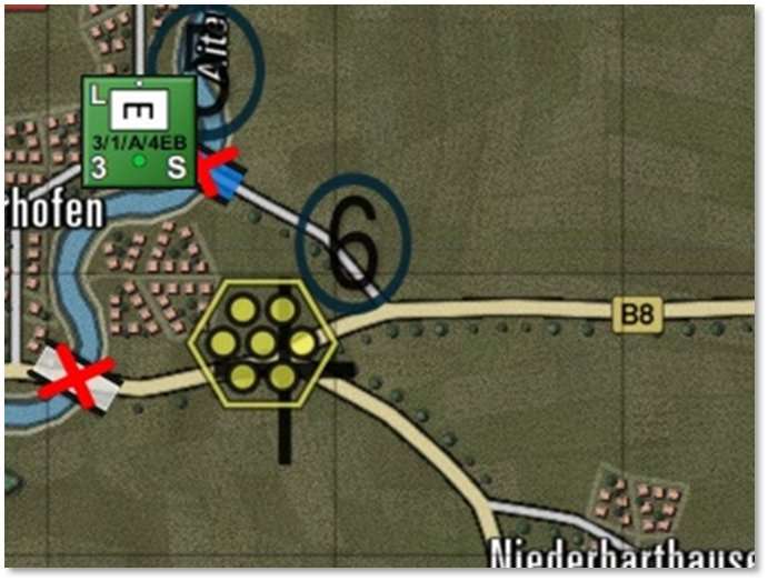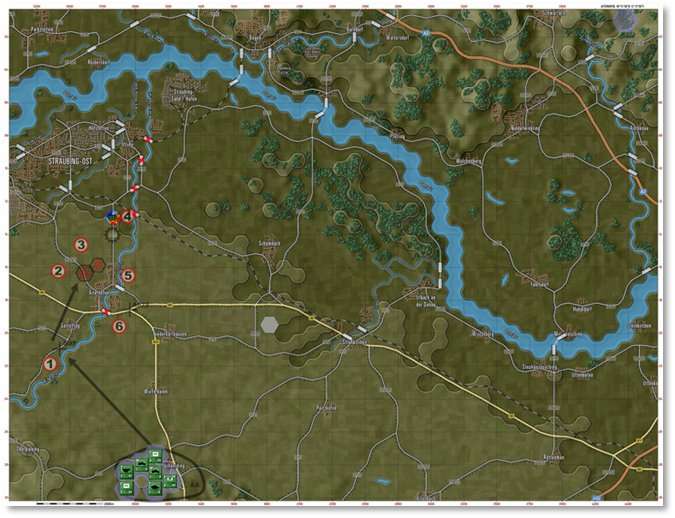 Once the bridge is laid, move the Combat Engineer’s units across the deployed bridge. Select all the engineering units except the AVLB that laid the bridge and move them to hex 0520, the town of Geltolfing. Move the AVLB to hex 0521 on the other side of the river to retrieve the bridge. You don’t want to leave an unattended bridge for the enemy to use.
