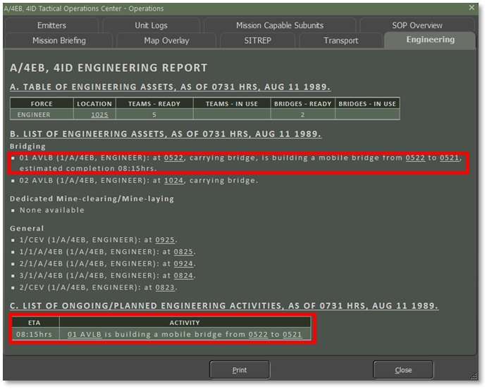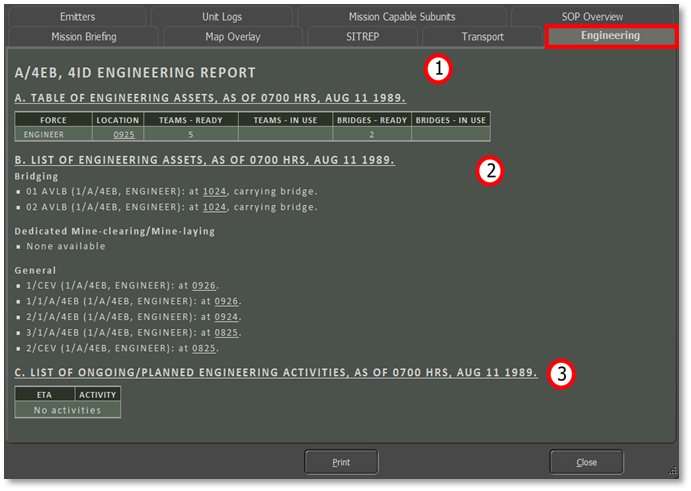 The Engineer Report provides a comprehensive overview of all engineering support available and current operational efforts. It includes ① a table and ② a categorized list of engineering assets, covering bridging equipment, dedicated mine-clearing and mine-laying systems, and general engineering tools. ③ The report also outlines ongoing and planned engineering activities, ensuring leadership remains informed of mobility, counter mobility, and survivability efforts across the operational area.