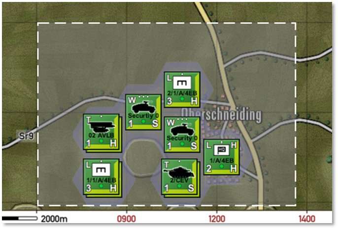 The image above displays the operational graphics along with the units of 1/A/4 Engineer Bn. For this tutorial, you will notice black arrows showing where you will move your forces. Each numbered circle is the phase number for each task you will do.