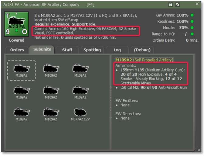 You will notice that this artillery battery with the first red box has 160 rounds of HE, 96 rounds of FASCAM, and 32 rounds of Smoke total for the battery. This indicates that this artillery unit can fire Smoke and FASCAM missions. And you will also notice that FSCC controls the unit. The red box to the right is for a single howitzer with 20 rounds of HE, 4 rounds of Smoke, and 12 rounds of Scatterable mines. However, we want to override the FSCC and fire smoke rounds on the other side of the river.