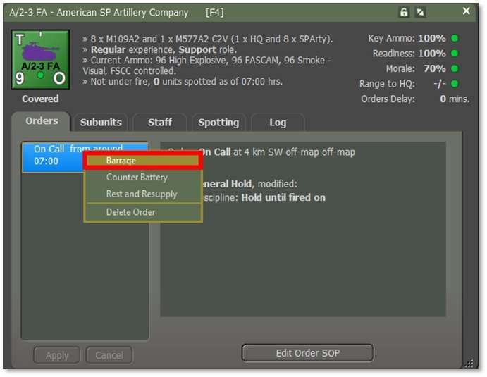 Have the artillery battery lay a smoke screen on the west bank, concealing the AVLB laying the bridge. Select the A/2-3 FA battery on the OOB tree and right-click to bring up the following Dashboard screen, as shown below.