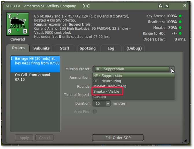 Here, you can adjust the number of rounds, the time of impact, and the duration. Leave the rest of the settings for this tutorial as shown in the screenshot above. Then click on the “Apply” button to confirm this Fire Mission. Exit with the “X” in the top right corner.