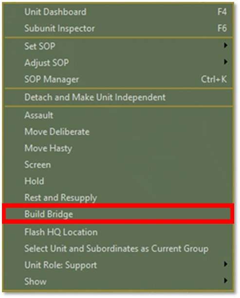 The units move. The 01 AVLB is now in position next to the riverbank and can be ordered to lay a bridge over it by selecting the “Build Bridge” button, as shown above.