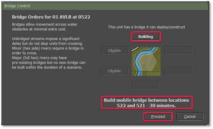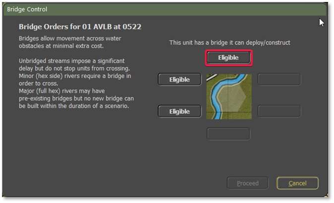 Depending on the actions of other units and the location you select near the river, the number of Eligible bridging locations may differ from what is shown here.