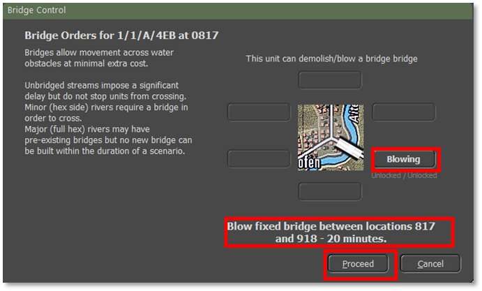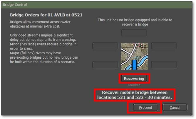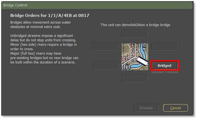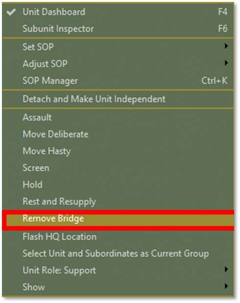 Select the engineer squad and issue the “Remove Bridge” command, as shown above. The Bridge Control screen will appear. Select the “Bridged” location as in the image below.