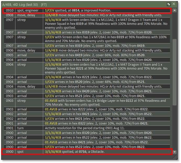 At 0900, 3/1/A/4EB, spotted enemy obstacles. At 0910, 1/CEV spotted an improved position, as shown in the radio log. However, as shown above in the screenshot of the radio Log, they cannot detect any minefields.