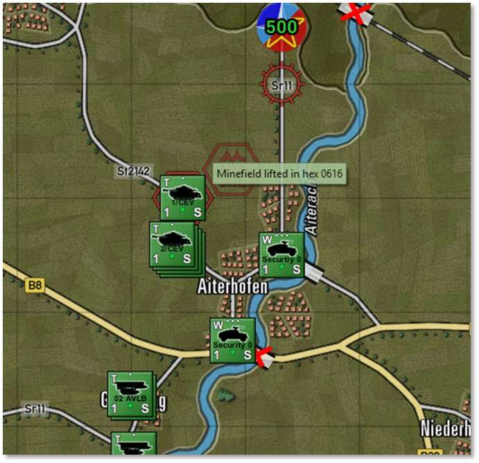 Move one of the combat engineer Squad or one of the CEVs to the location of the suspected minefield (hex 0616). The only way to determine if there are mines in the hex is for the unit to move into the hex. In the following turn after confirming the presents of mines, give the Combat Engineer/CEV unit a “lift mines” order from the orders menu.