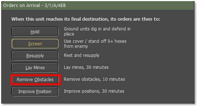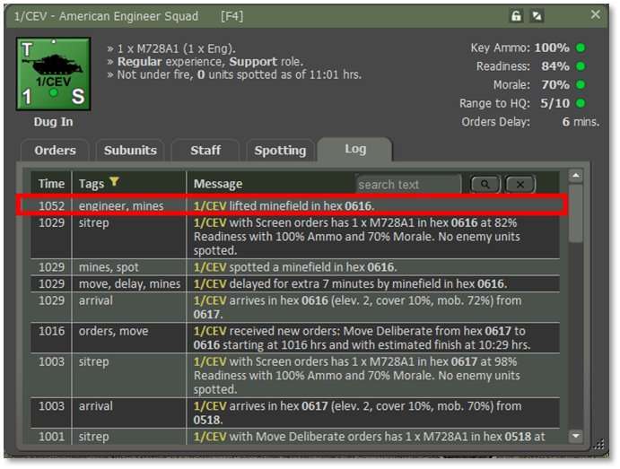 It may take several turn resolutions to lift the mines. Once the mines have been cleared, a popup message will appear on the map. Also, there will be a notation in the unit’s log.