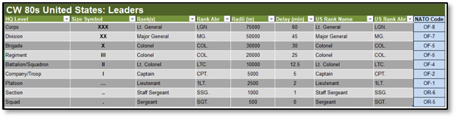 These values represent certain size, naming, or command and control parameters specific to a given country in the game. Changes made to values on this spreadsheet tab will impact the overall command cycle of units from this country.