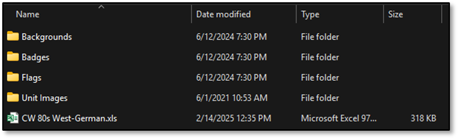 The location of the National Data Files and supporting files is found in [Game Setup Location]\Modules\Common\Data[Your Country File Name*]. Within this Country Named location you need to have the following sub-folders for supporting materials: Backgrounds, Badges, Dialogs, Unit Images. See the image below.