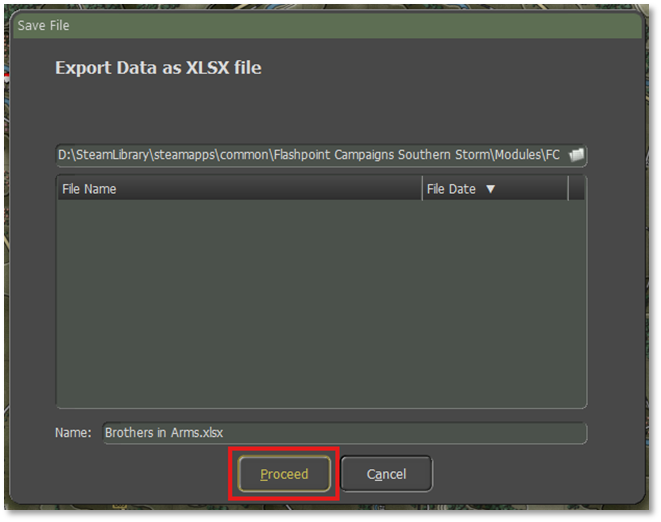 Hit “Proceed” and you are presented with the Save File screen for the exported XLSX file. By default, the game uses the scenario name. You can use that or change it to something else. It may be a good idea to export the file twice and name one with “_Original” or something similar in case you wish to revert changes back to the original scenario information.