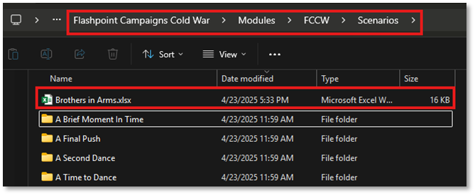 The exported XLSX file is now located in the Scenarios sub-folder of the FCCW module. In this example, we are using a scenario for Cold War and the “Brothers in Arms.xlsx” file is in the [installed location]/Modules/FCCW/Scenarios or if a Steam install it is located in [Steam Drive]\ D:\SteamLibrary\steamapps\common\Flashpoint Campaigns Cold War\Modules\FCCW\Scenarios as seen below.