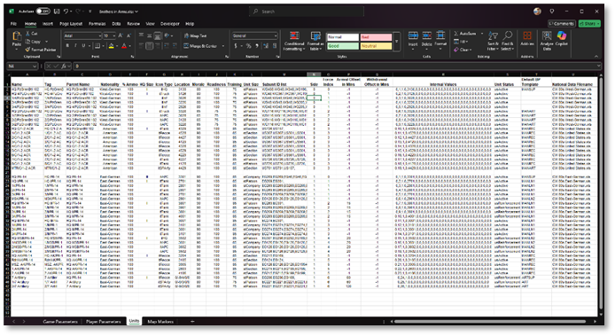 D. Nationality: This is the data folder name of the National Data Filename found in column “U”. If you are adding new units from a new National folder the name in column “D” and the XLS Filename in “U” must be named exactly as they are in the folder and file or the game will crash when it can’t find the data. You can mix units from any number of nations in this manner. The subunits in column “M” must ALL come from the same national data file.