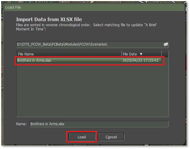 Select the correct XLSX data file to import in the list, in this case “Brothers in Arms.xlsx” and then hit “Load” to have the data imported into the scenario. Currently there are no indicators that things are done. Give the process a few seconds and then look for your modifications.