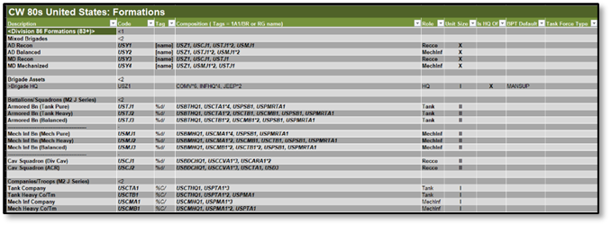 You can assign more than one filter to a row if they are comma- delimited. This allows for certain formations to appear in multiple Task Force Types. Check the supplied data files to see examples of Task Force Type use.