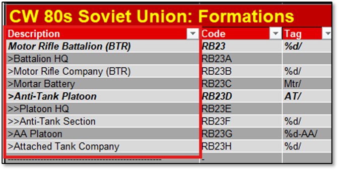To put together an OOB, the names and use of the node indent symbols “>”, “>>”, and “>>>” allow the Scenario Editor to generate an indented list based on the indents and the names. The above Motor Rifle Battalion is comprised of a “>”Battalion HQ, “>”Motor Rifle Company, “>”Mortar Battery, “>”Anti-Tank Platton, “>”AA Section, and “>” Attached Tank Company. The Anti-Tank Platoon has a third level breakdown with the “>>” noted platoon element entries.