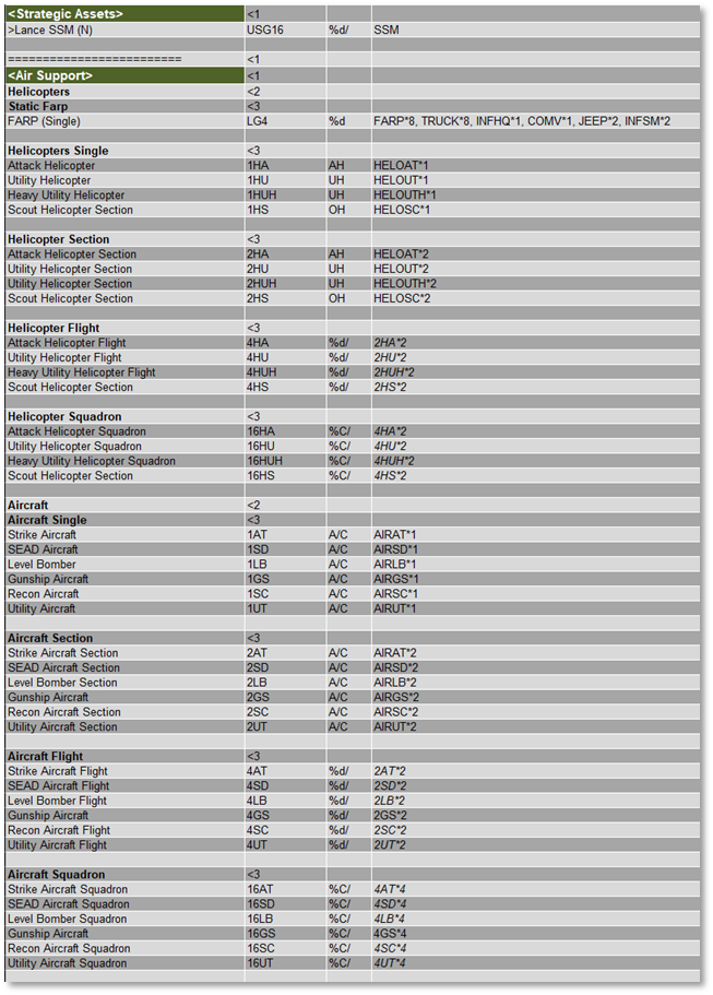 In the example below, the indent codes of “<1”, “<2”, and “<3” are placed to create the indented open/close node points for the various formations. In this case, the Air Support formations. The Indent Codes are circled in red.