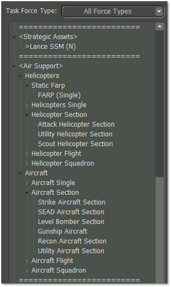 These codes are used by the Scenario Editor to filter out certain mission types of units. This allows the user to zero in on certain formations they need to add to the scenario. Valid Task Force Types can be found in Section 9 above. Task Force Types should be used on all formations you want to group and the Formation Identifiers and separators to keep the look and information clear.